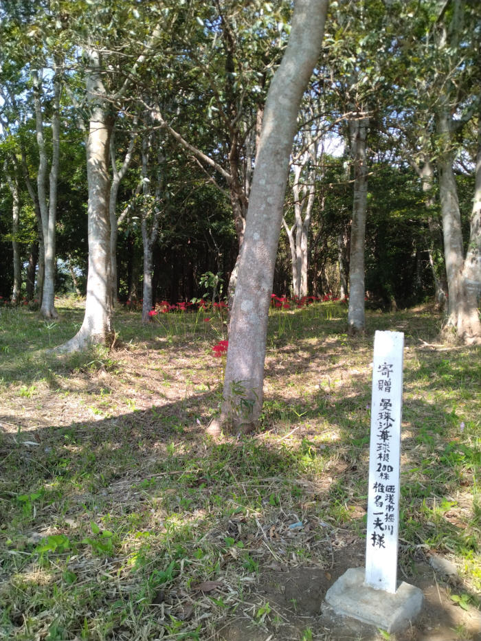 匝瑳市堀川 椎名一夫さん寄贈の曼殊沙華球根200株 前宮司生存中(2023年4月30日)に神社西側山林に植栽しました。2年後